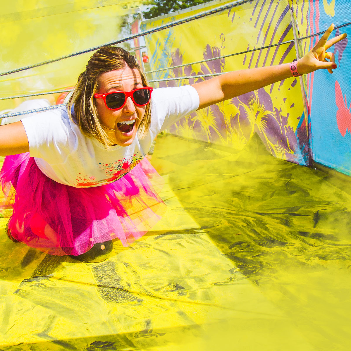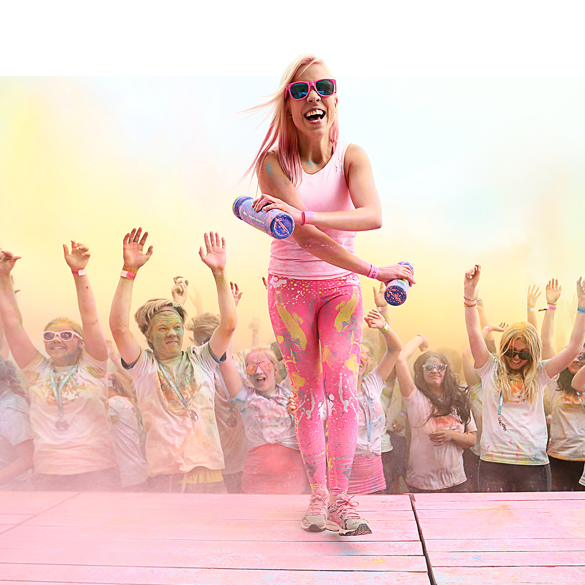 Matkan varrella koet useita väripisteitä, joissa ilmaan heitetään violetin, pinkin ja magentan sävyjä. Jokainen kilometri vie syvemmälle festaritunnelmaan.